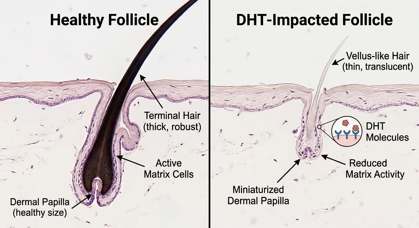 When DHT attaches to the receptors in your hair follicles, it triggers the miniaturization process. Over several cycles, the follicle becomes so small that it can no longer produce a visible hair. Age also plays a role, as the cumulative exposure to DHT and the natural slowing of cell regeneration make the scalp more vulnerable over time.