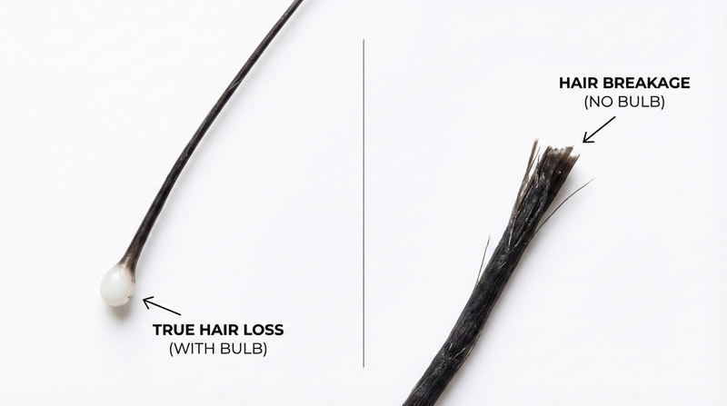 The difference between breakage and true hair loss: breakage creates short, broken pieces at various lengths. True hair loss means hairs are falling from the root.