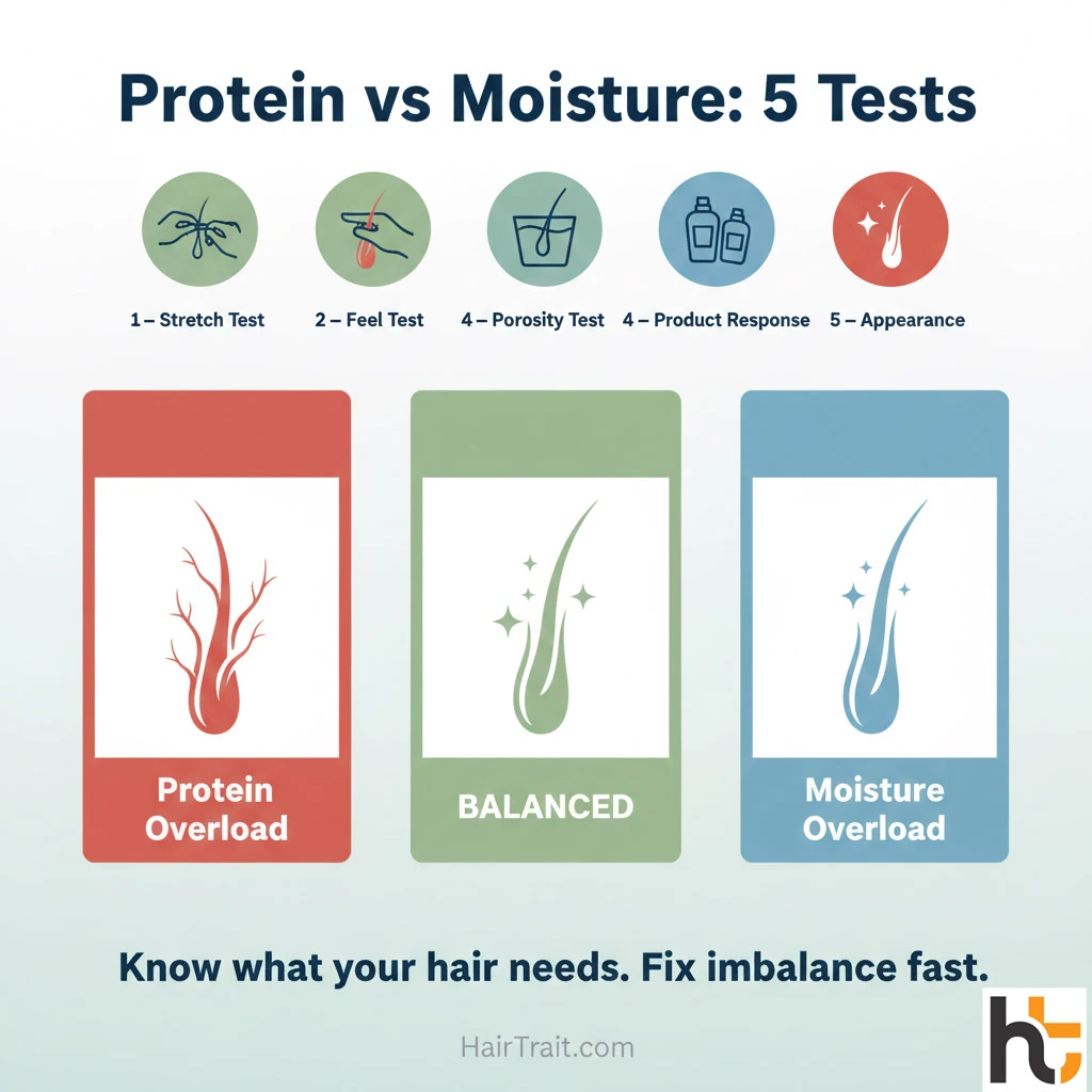 Quick Answer: To determine protein vs moisture balance, check for these signs: Protein overload = stiff, brittle, breaks easily. Moisture overload = limp, mushy, stretches too much. Balanced = strong with stretch, holds curl, bounces back. Use the 5 tests in this guide to identify your specific need.